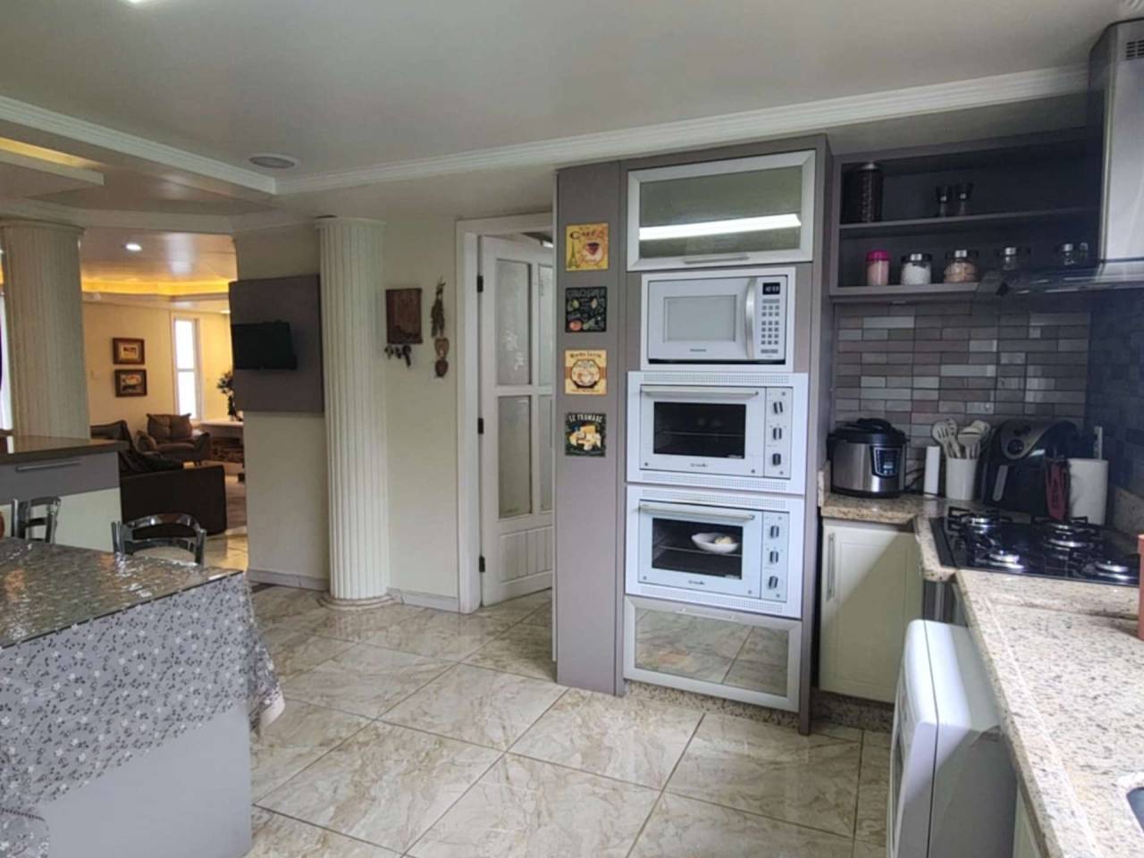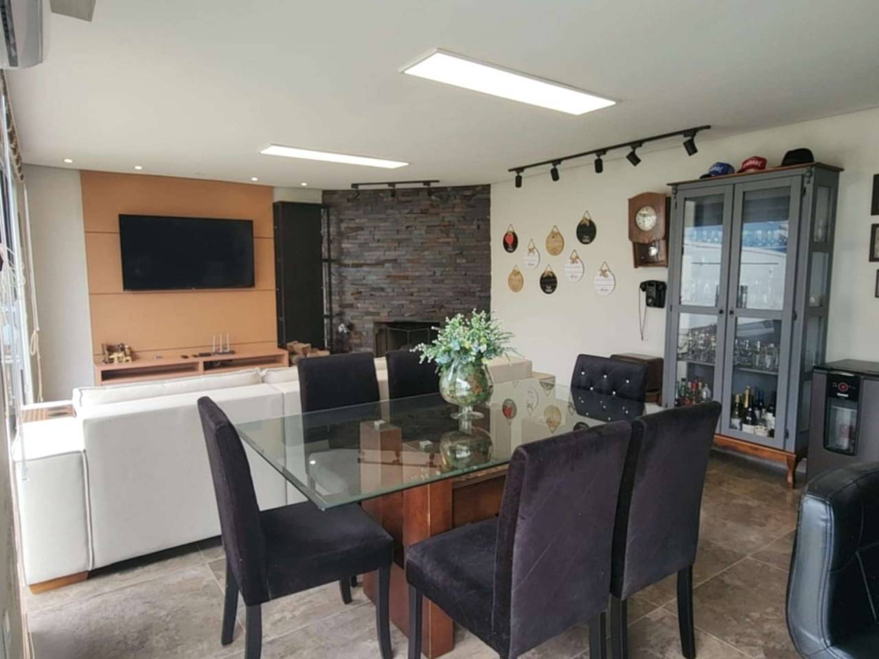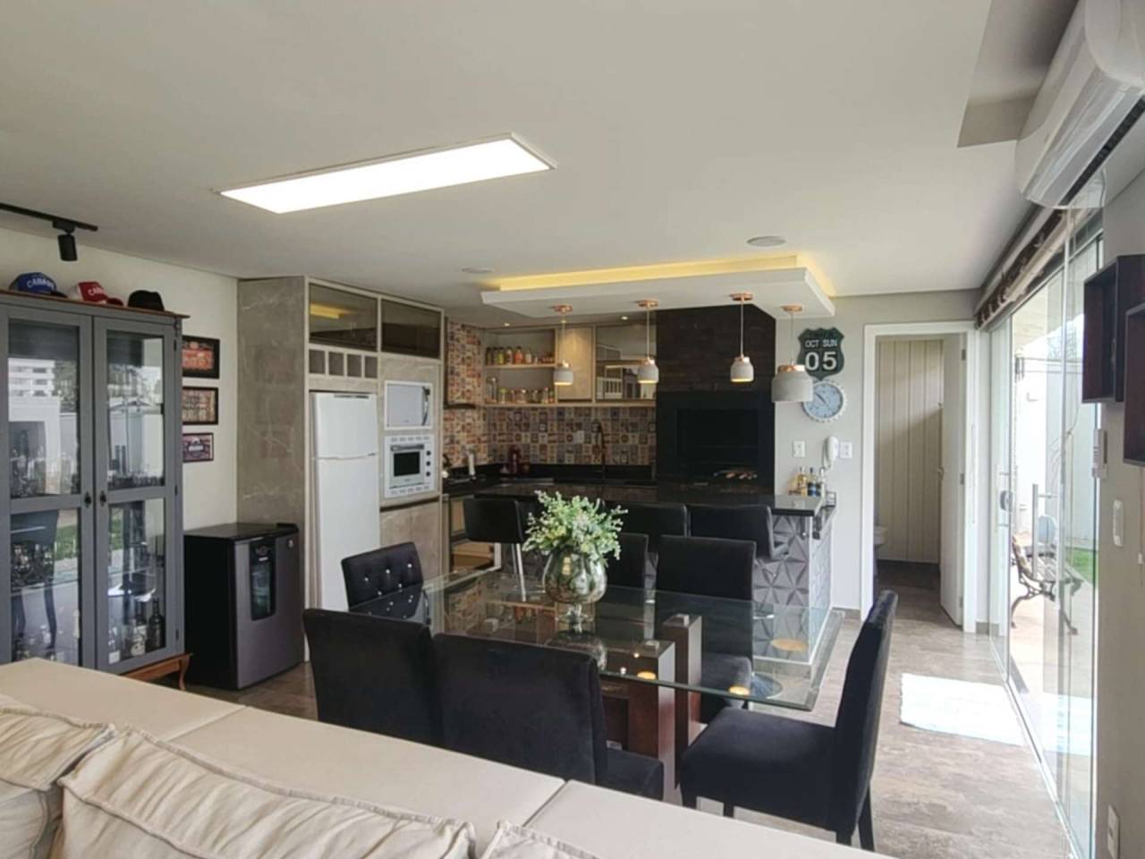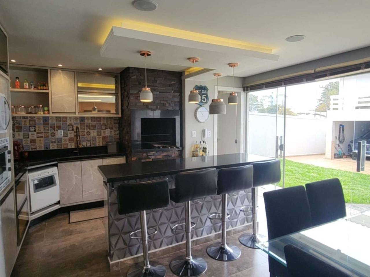 Edícula fundos com cozinha gourmet, toda equipada com churrasqueira, sala TV c/ lareira, jantar, lavabo, escritório. Acabamento com forro de gesso, piso porcelanato, vidros blindex.