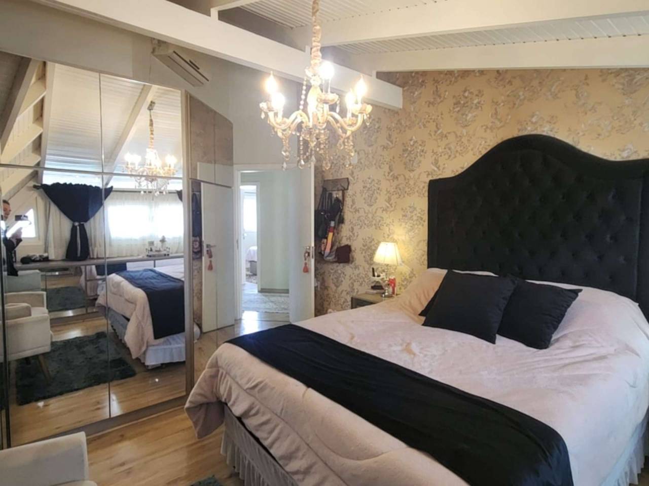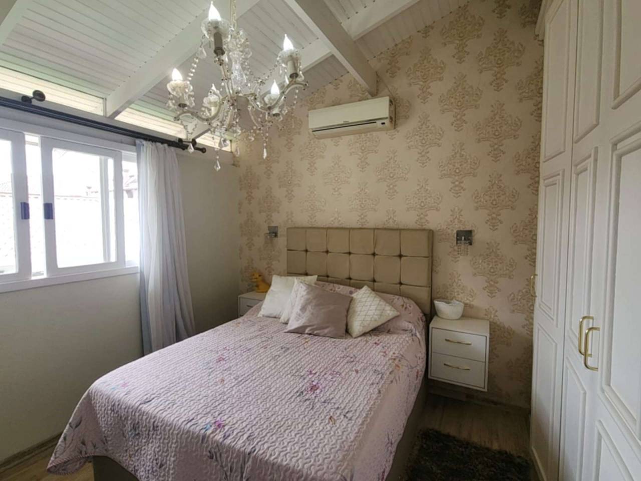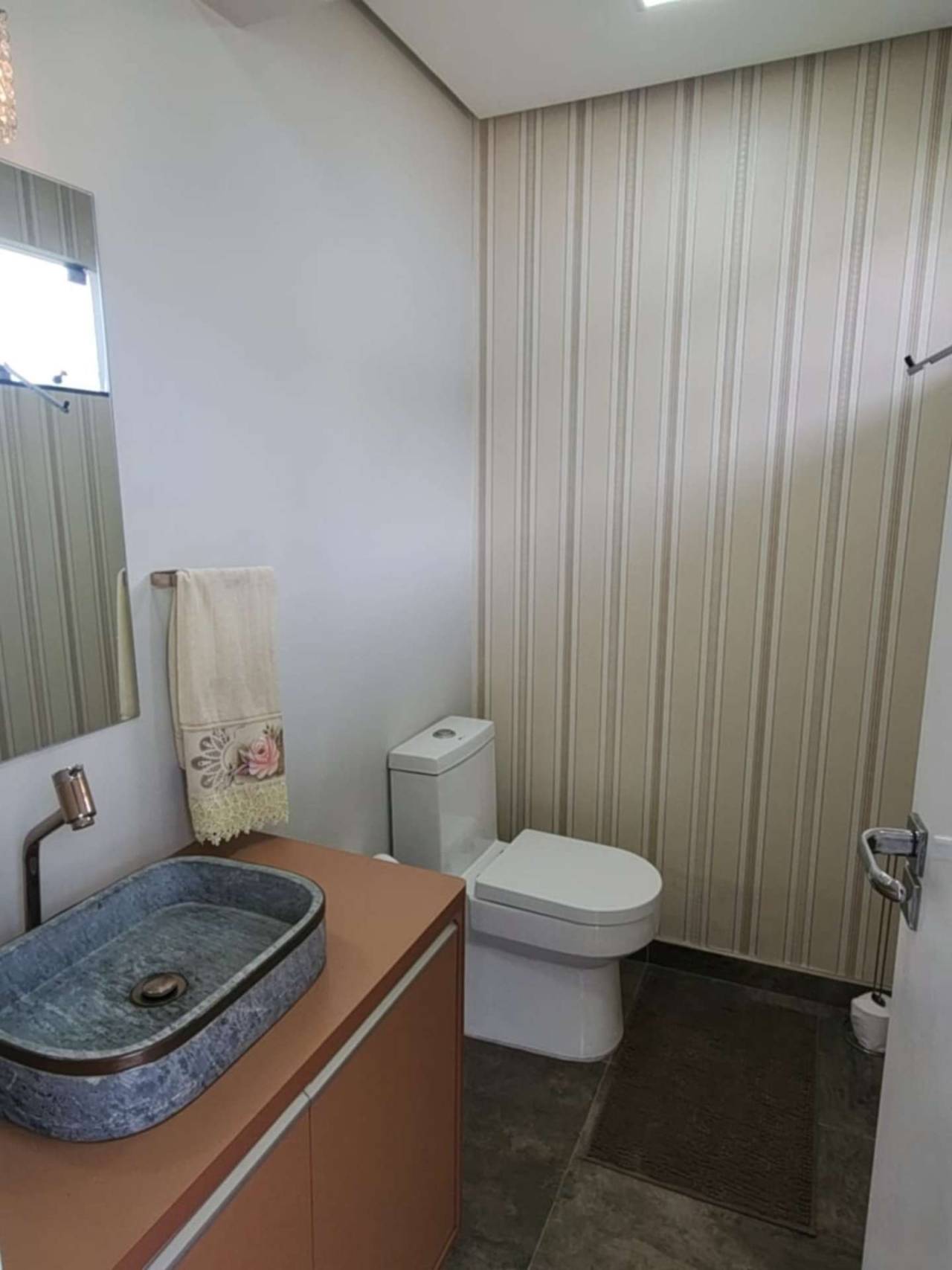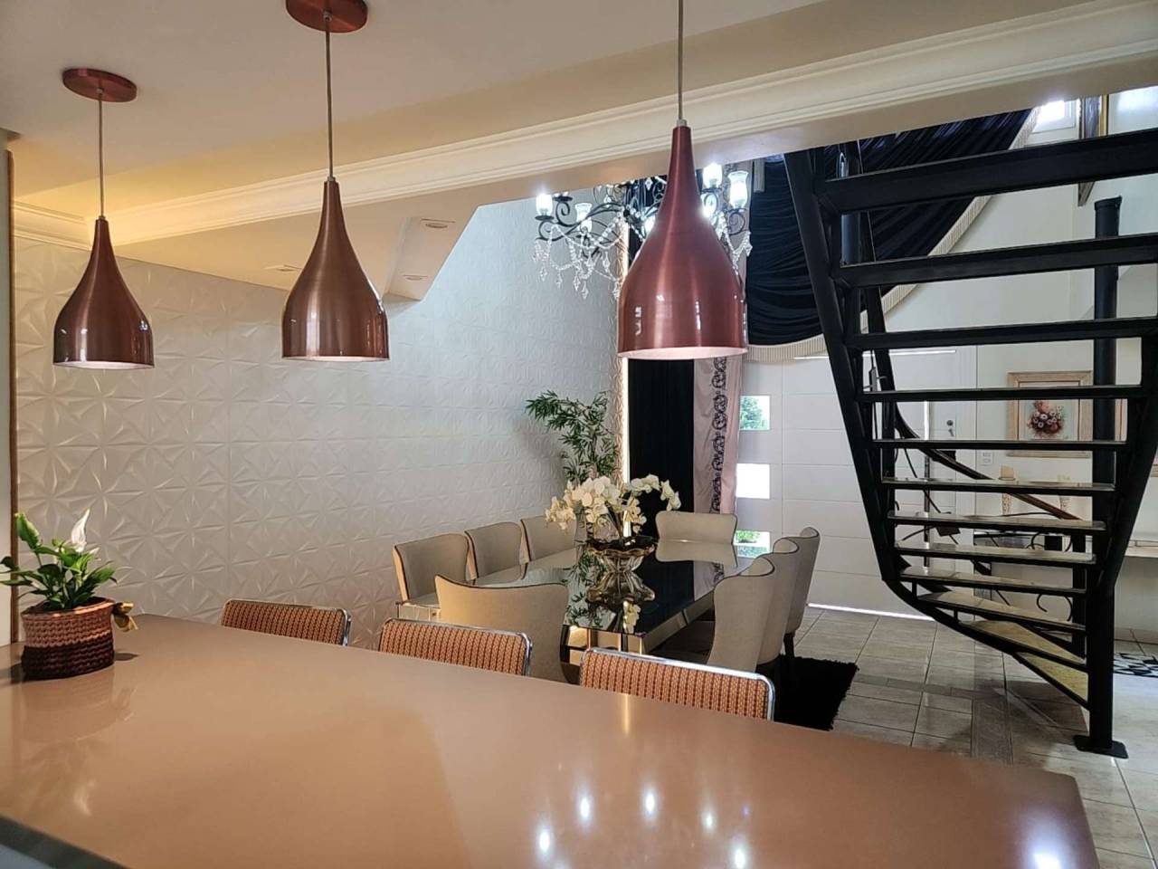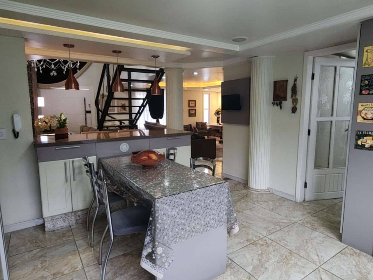 Casa de Alvenaria com 2 dormitórios, na parte superior, contém 01 suíte + 2 dormitórios, BWC, hall intimo, sala de TV e sacada; parte inferior com sala social e jantar com pé direito alto, TV, cozinha com bancada (ambientes integrados), lavabo, área de serviço e garagem para 02 carros. Acabamento com forro de gesso trabalhado, aquecimento a gás, móveis planejados.