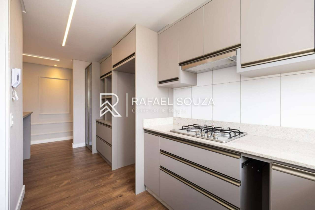 A cozinha é destaque: melhor aproveitamento do espaço, em tons clean, com mobiliário planejado, excelente aproveitamento de espaço e bancada funcional.