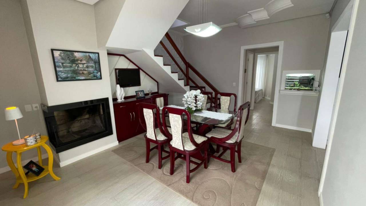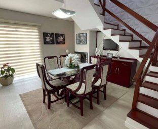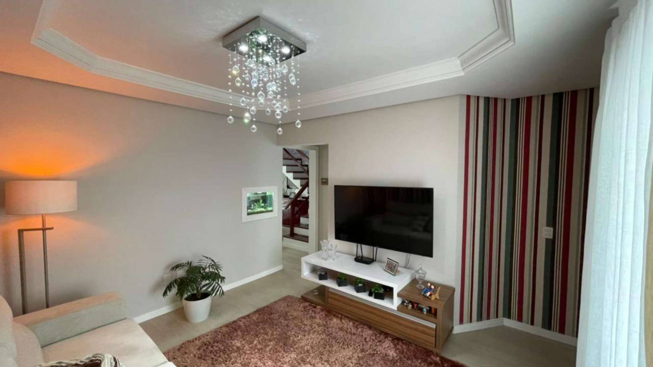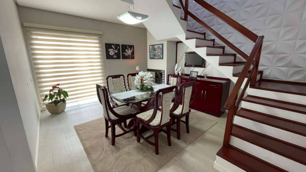 O layout inteligente proporciona privacidade e integração. No andar superior, uma suíte privativa, dois dormitórios e banheiro social. No andar inferior, mais um quarto, salas de TV e jantar integradas, cozinha espaçosa, banheiro social e garagem para 3 veículos. A área de serviço interna complementa a praticidade.