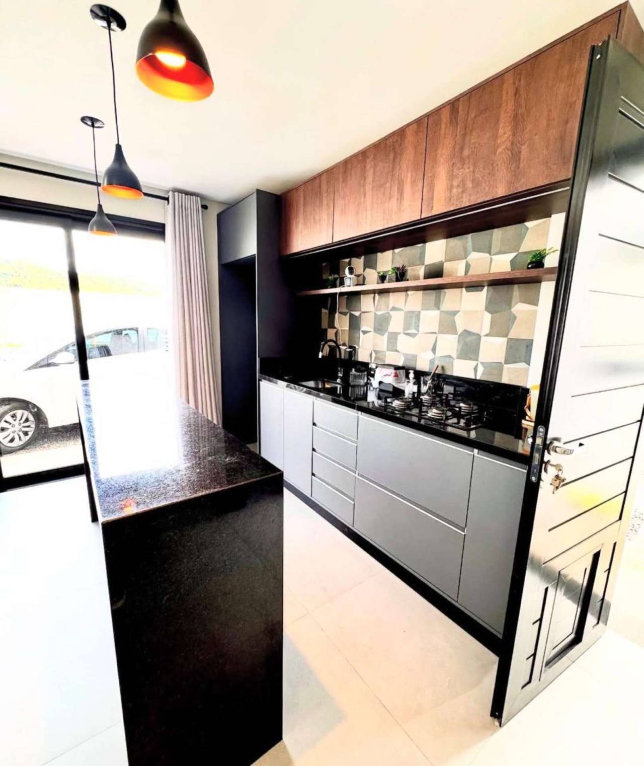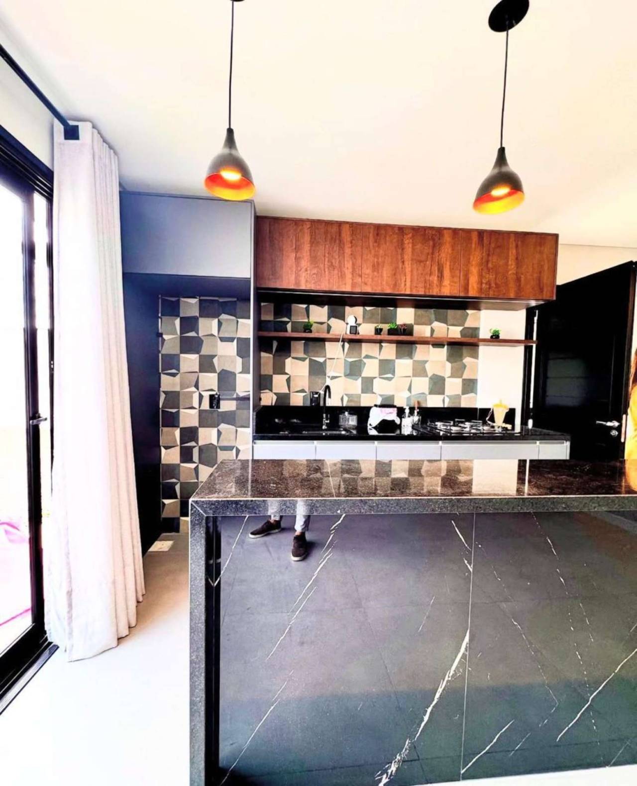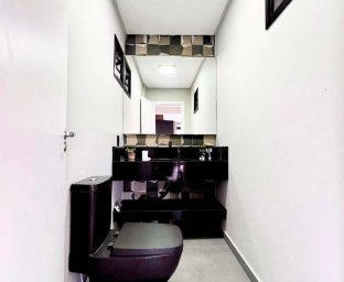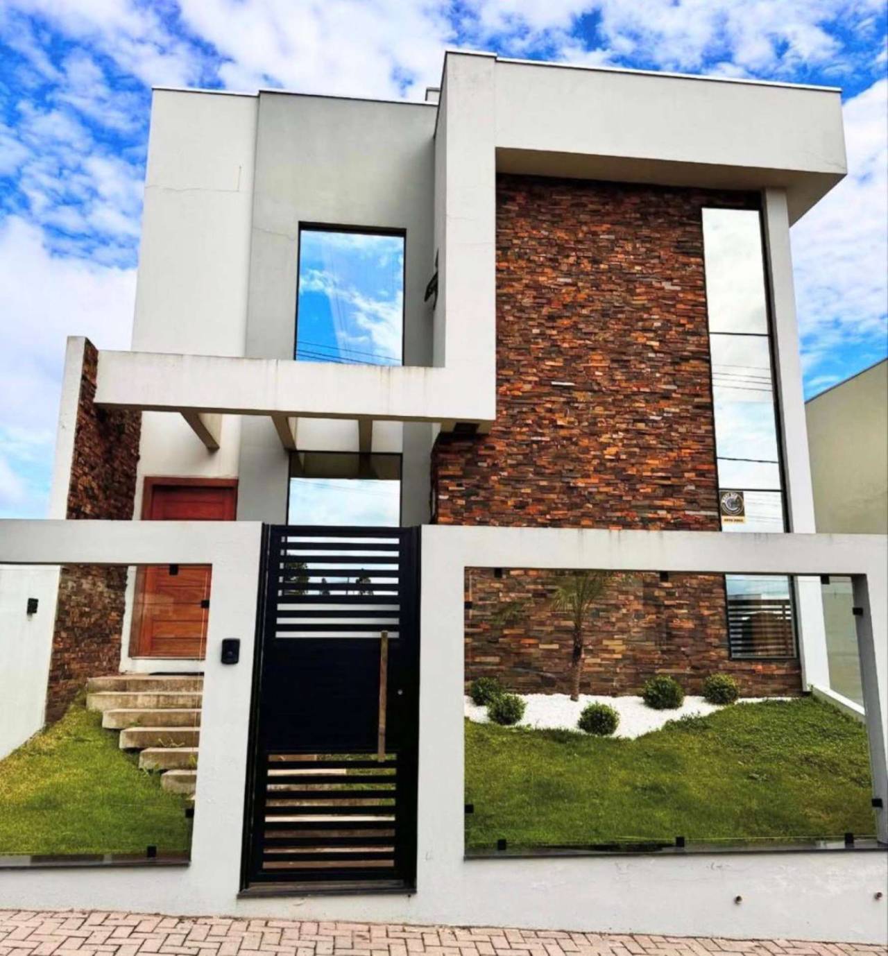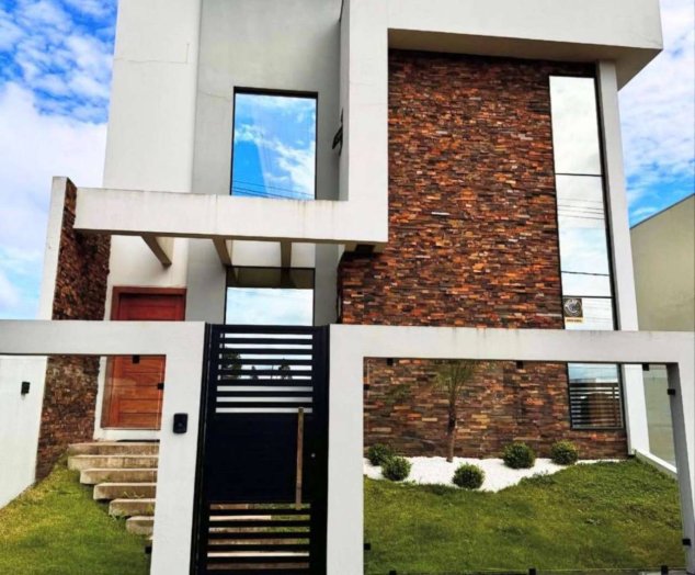 Espaço gourmet com móveis sob medida, banheiro e depósito Aquecimento a gás Porcelanato Forro em gesso Fachada moderna com pedras decorativas Esquadrias em alumínio