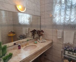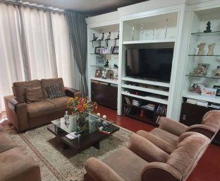 Com 1 suíte master + 4 dormitórios, bwc, sala social p/ 3 ambientes, estar social c/ lareira; estar íntimo(tv c/ lareira) cozinha c/ planejados, escritório, edícula fundos c/ área de churrasqueira, garagem para 2 carros, depósito, área de serviço e terraço.