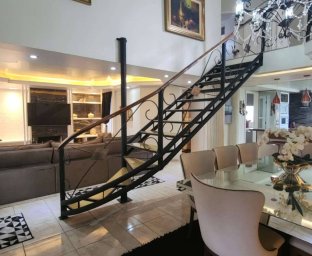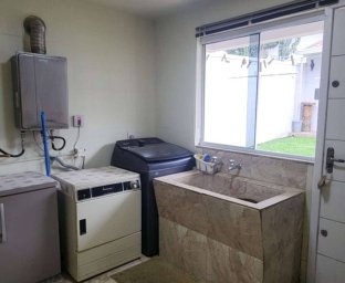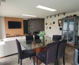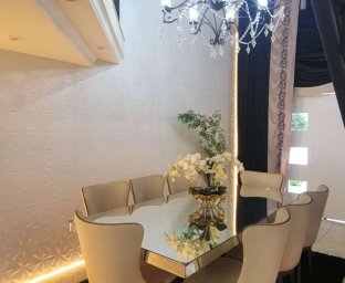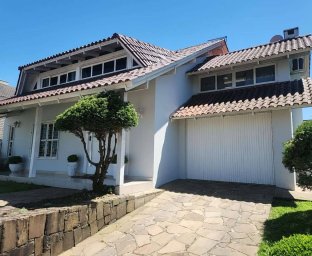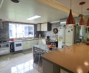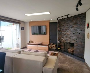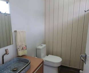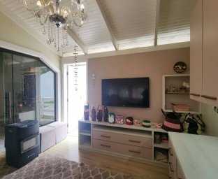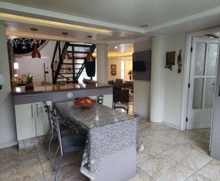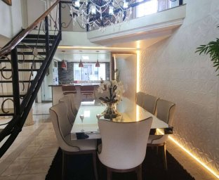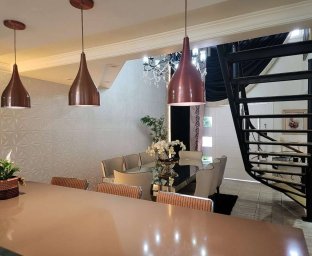 Casa de Alvenaria com 2 dormitórios, na parte superior, contém 01 suíte + 2 dormitórios, BWC, hall intimo, sala de TV e sacada; parte inferior com sala social e jantar com pé direito alto, TV, cozinha com bancada (ambientes integrados), lavabo, área de serviço e garagem para 02 carros. Acabamento com forro de gesso trabalhado, aquecimento a gás, móveis planejados.