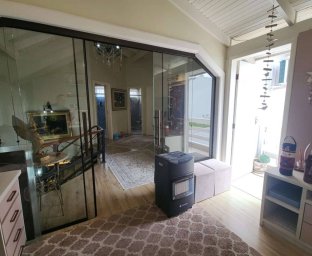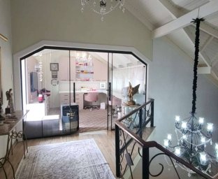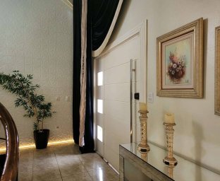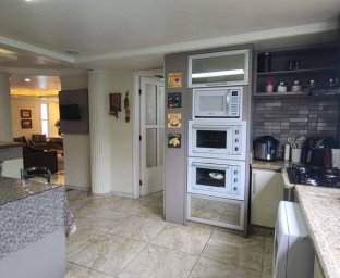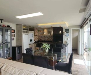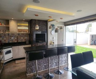 Edícula fundos com cozinha gourmet, toda equipada com churrasqueira, sala TV c/ lareira, jantar, lavabo, escritório. Acabamento com forro de gesso, piso porcelanato, vidros blindex.