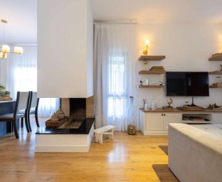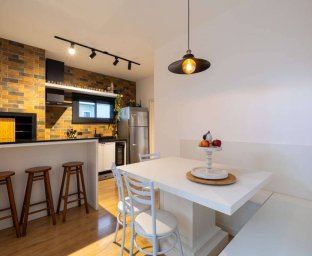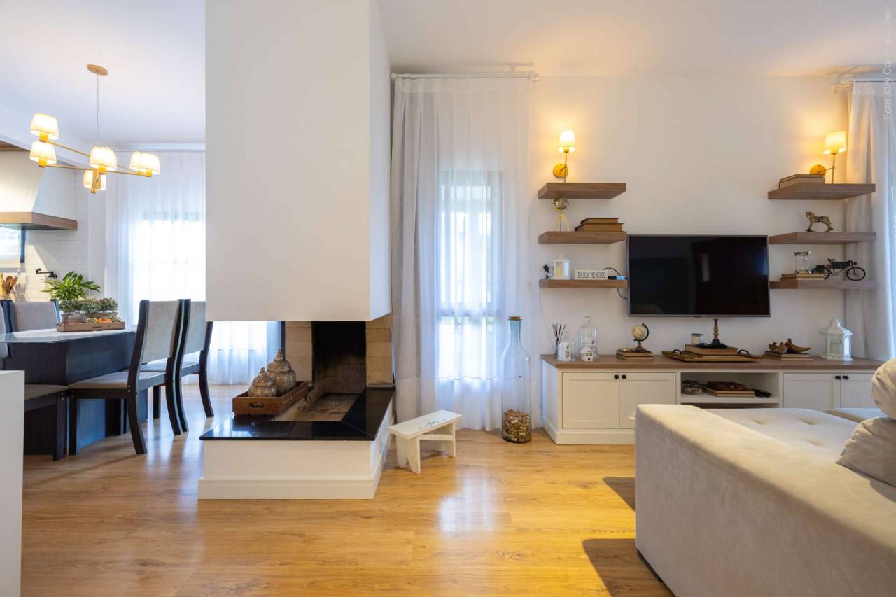 - Living Integrado: Sala de estar, jantar e cozinha mobiliadas e com decoração Farm, e uma lareira espetacular criando um ambiente caloroso para os dias frios da Serra, unindo o charme do campo à funcionalidade moderna.